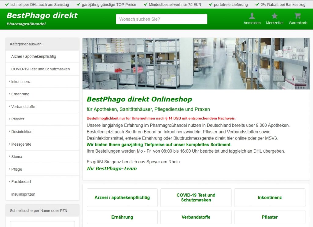 Apotheken und Sanitätshäuser, die sich unsere Angebote nicht automatisch direkt in die Warenwirtschaftssysteme einspielen lassen wollen, können sich auch unter www.bestphago-direkt.de registrieren und in unserem Onlineshop die Einkaufspreise einsehen. Auf Wunsch kann dann direkt aus dem Shop heraus bestellt werden.